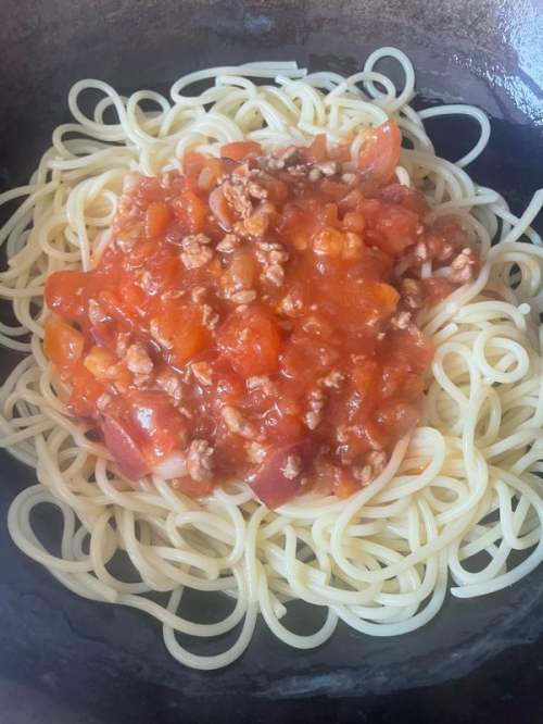 - 7意大利面捞出沥干,可过一下凉水,让它更筋道,倒入番茄肉末酱,拌匀