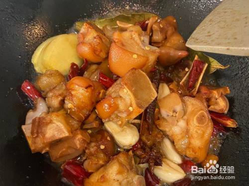 插手过滤水分的猪蹄快速翻炒上色(因为本人不太爱吃甜的,以是糖加的少,颜色不太深。想颜色重点的可以放老抽一勺)