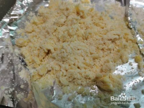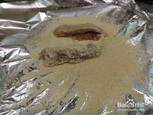 鸡翅捞出8个为鸡翅A,黄油面粉从冰箱拿出来,过下筛子,放锡纸上,把鸡翅A粘点黄油面粉,放到烤盘第一行