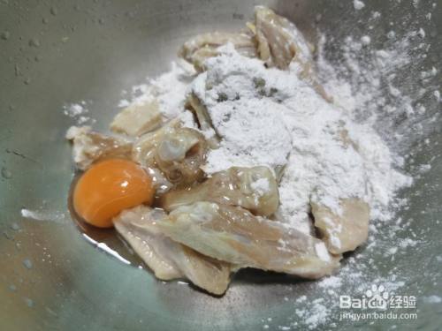 继续捞出8个鸡翅,为鸡翅B,加鸡蛋、两勺面粉搅拌匀称,然后把鸡翅B粘点干面粉放到烤盘第二行。