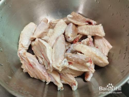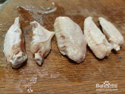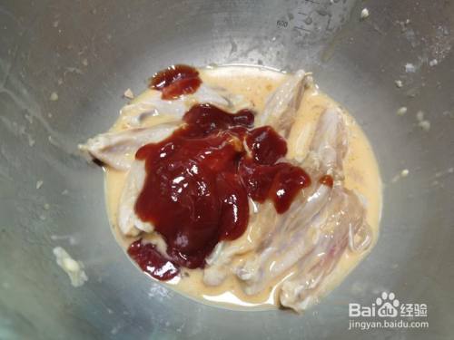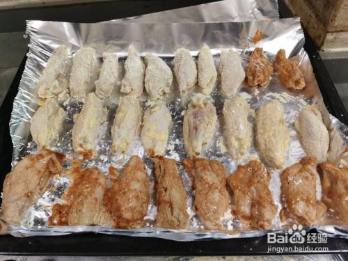 最后残剩的鸡翅为鸡翅C,鸡翅加鸡蛋、面粉和番茄酱搅拌匀称并摆放到烤盘第三行。