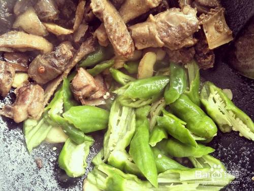 锅里放油,下姜片、大蒜子、辣椒,放少许盐,炒一下,再混淆鸭肉一路炒。