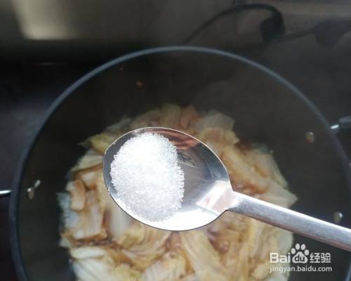 大火炬水烧开,看着菜咕嘟咕嘟冒泡之后,放入少量白糖。白糖可以提鲜