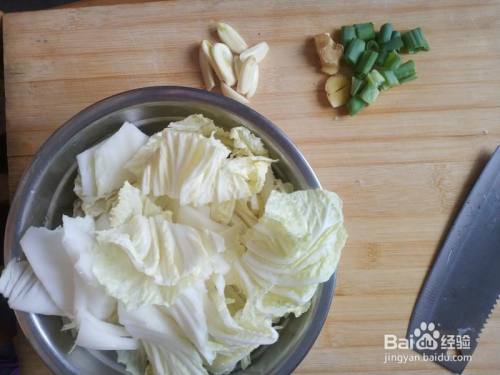 白菜洗净改刀,葱切段,姜切小片,蒜切小片。