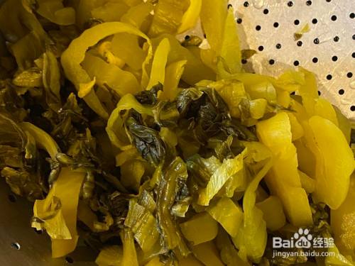 锅中不放油,下酸菜翻炒2分钟,到水分炒干,装盘备用