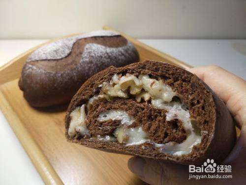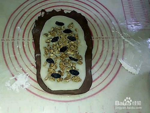 1.把麻薯擀开,放到面团上 2.放上核桃碎,黑加仑葡萄干,撒少量红糖。