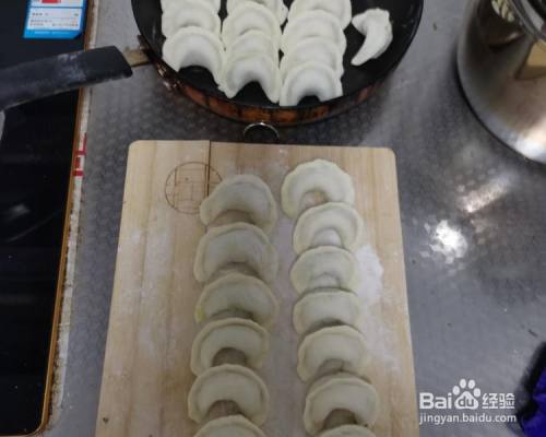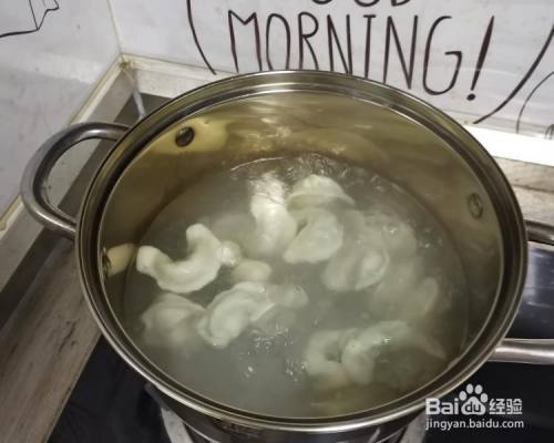 7.在锅中水开后,下入包好的饺子(多余的可放入冰箱中冷冻),再次煮开后插手半碗凉水,待煮开后,煮8分钟。饺子皮软后,关火出锅。