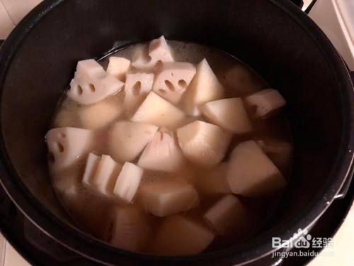 我用的是高压锅,以是20分钟以后加莲藕和凉薯。然后高压锅再炖20分钟或者平凡锅40分钟。