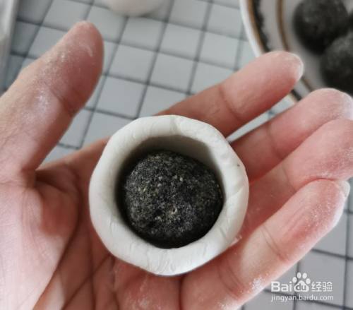 取一个剂子,搓圆,开窝,放入一个馅,收口做当作汤圆