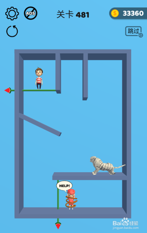 这一关的通关使命是解救底部的女孩,拉针共有四个,环境如图。