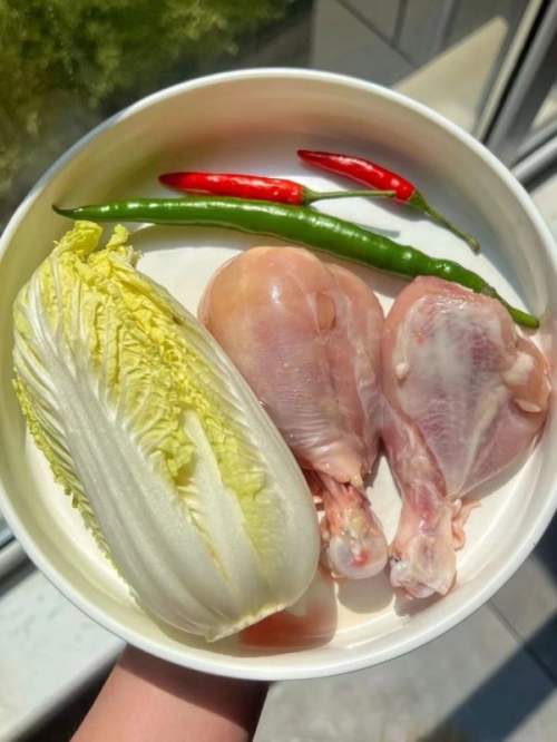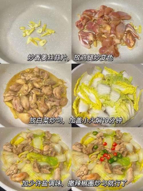- 3锅里放少许油加热(我用的不粘锅,以是只放了一点点油)放姜丝爆喷鼻后插手腌制好的鸡腿肉,炒到鸡腿肉变色就可以插手洗濯好的娃娃菜了(可以适当的改刀把娃娃菜一分为二),翻炒匀称后盖上盖子小火焖10分钟,然后插手一点盐调味,趁便把切好的辣椒圈放进去一路翻炒一下就可以出锅了。