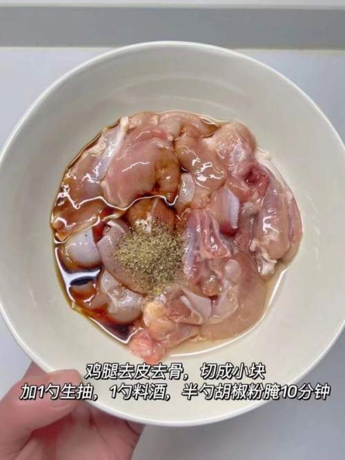 - 2鸡皮能去失最好去失,我个人不喜欢吃鸡皮,并且听说鸡皮脂肪指数有一点点↑ (听说的,没去证明)扯远了,继续:鸡腿去皮,去骨,切当作小块然后放生抽,料酒,胡椒粉腌制10分钟入味。