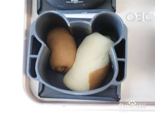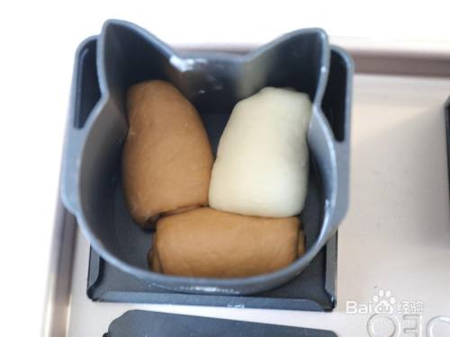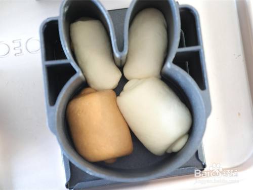 依次操作,三个面团一组。 这个模具是有底和盖的,以是我们入模的时辰模具需要安装底盖,然后放面团。 此中兔子模具直接将1个白色面团擀开后翻面卷起呈长条,