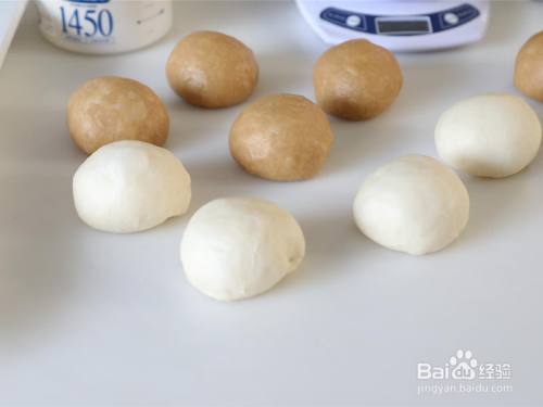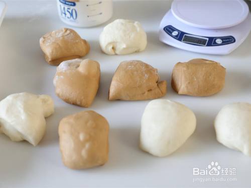 将发酵好的面团掏出。支解面团,注重不要拉撕裂坏面团,100g摆布/个。