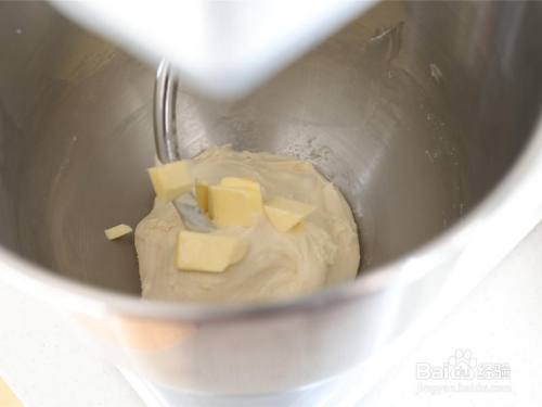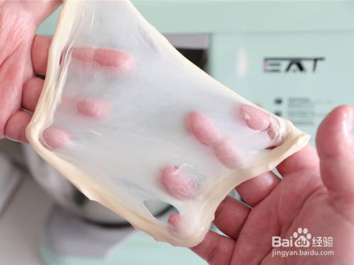 跟着黄油融入面团,面筋也逐渐形当作。转5-6档,继续打面至完全扩展阶段。 能拉出透明薄膜、具有很好延展性的阶段。