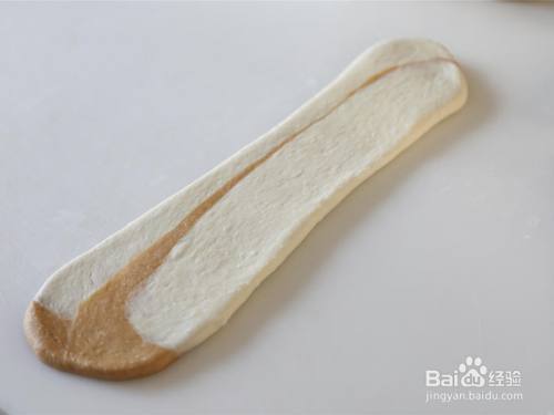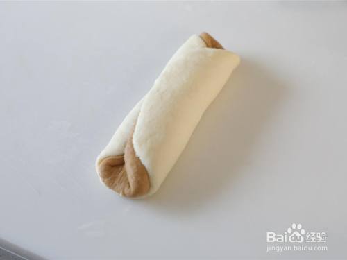熊头模具将此中一白一咖色面团叠起来,如上述历程做擀卷整形