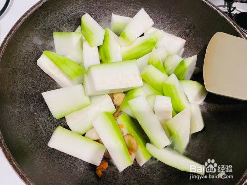放入节瓜继续炒。炒到有半透明的时辰加水。