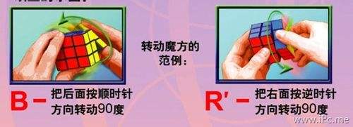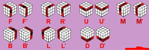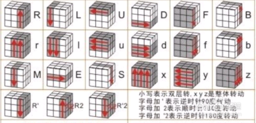然后破解魔方功略里会用字母来申明要动弹的1层或1面,以及偏向:例如:R(代表右面顺时针转90度),R`(代表右面逆时针转90度),R2(代表右面顺时针转2次90度)