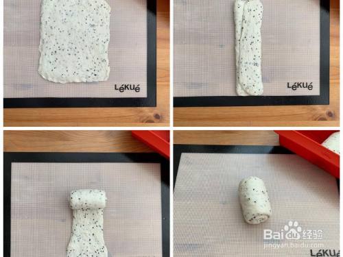 取一块面团擀开,翻面,标的目的中心半数,擀长,卷起;