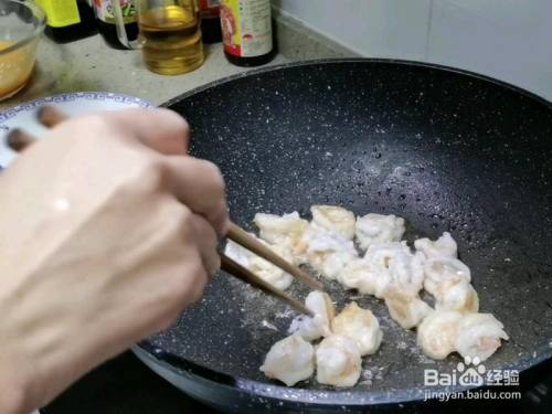 虾仁冷藏半小时后掏出,加一勺花生油搅拌匀称。锅中宽油,烧热下入虾仁煎至两面金黄(此时虾仁基本熟了),盛出备用。 锅中剩油掏出一小勺晾凉备用。