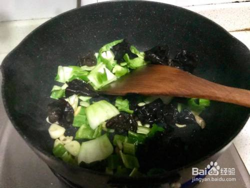 插手不易炒熟的木耳、青椒,菜头翻炒至断生