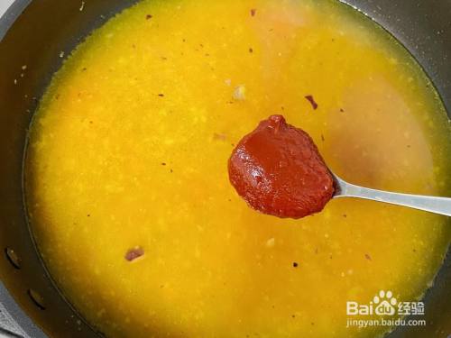 倒入一大碗水,插手2勺番茄酱小火煮开