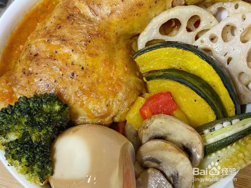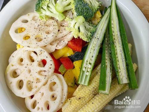 食材放在碗里,撒少量橄榄油黑胡椒和盐,搅拌匀称
