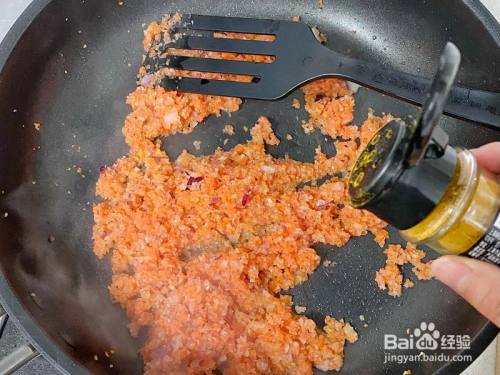 锅中倒油,放入胡萝卜末和洋葱末炒喷鼻,插手少量咖喱粉炒出咖喱喷鼻味