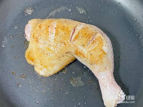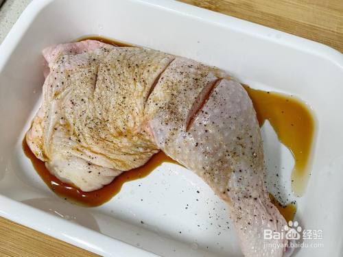 鸡全腿外貌切三刀,倒少量生抽料酒黑胡椒和盐腌制20分钟