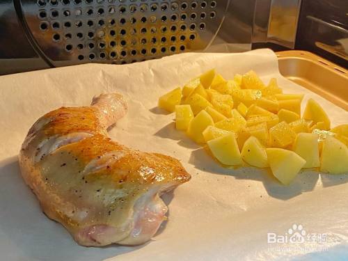 小土豆刷油,和煎完的鸡腿一路放入烤箱180度烤30分钟
