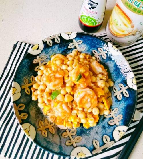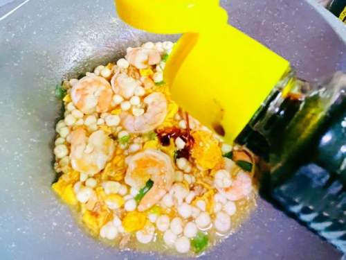 - 5再入少许炒蛋与鸡头米翻炒,加柠檬沙拉汁