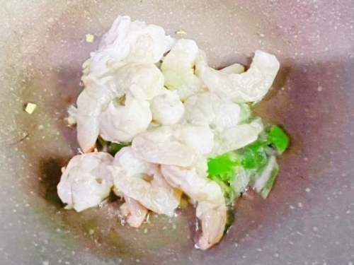 - 4热锅上油下葱姜末,再入浆好虾仁