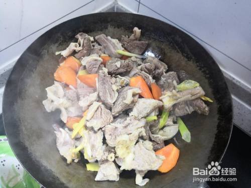将沥干水的牛肉放入炒锅和配料一路翻炒至呈现浅浅的焦边。