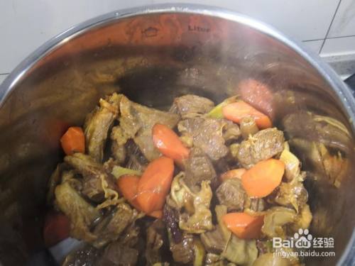 之前煮牛肉的汤倒入高压锅中,多的话就少倒点,然后插手胡萝卜白萝卜芹菜洋葱西红柿,最后把炒好的牛肉一路倒进去,高压锅盖锅盖炖15分钟