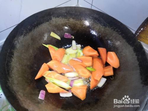 另用一个炒锅,加油炒葱姜蒜小洋葱片和胡萝卜,翻炒至喷鼻味出来,插手冰糖,小火继续炒制冰糖融化。
