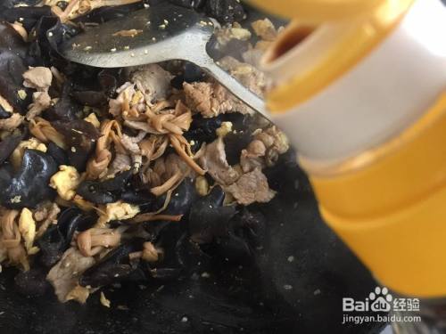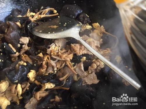 锅中倒入少许色拉油,放入木耳和黄花菜翻炒半晌插手备用的断生的肉片,这个时刻肉喷鼻就出来了,倒入备用鸡蛋块