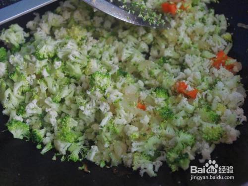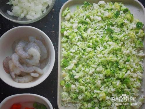 筹办好质料。双色花菜米切碎,洋葱切小丁,胡萝卜可以切当作花形。