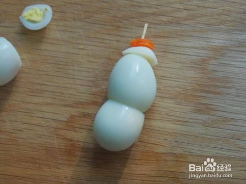 用牙签把两个蛋串在一路,切失的一块也可以一路串上当帽子,不华侈!