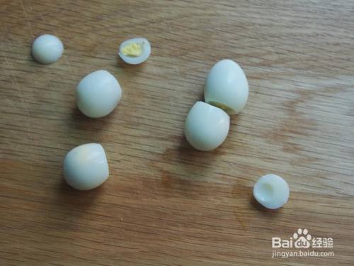 下面再来做两个小雪人,增添点圣诞氛围~ 四个鹌鹑蛋,两个把顶部切失一块。完备的一个当头,切失的一个当身体。