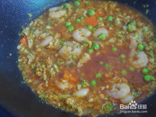 再放入青豆煮一下子,最后放入虾仁,大火收汁,到浓稠状即可。要是当本家儿食吃,放一块调料就够了。拌饭的话可以再多加半块。