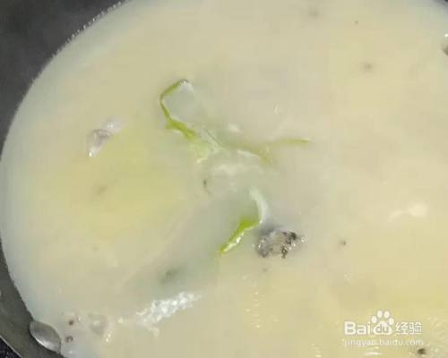 鱼汤差未几熬上15分钟后把鱼捣烂继续煮几分钟(我们是喜欢和纯纯的汤以是把鱼捣烂,不喜欢这样的可以不要把鱼捣烂)