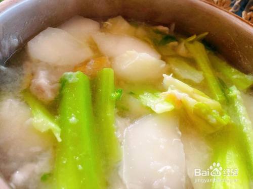 可做滑肉汤的蔬菜品种许多,冬季以菜头,萝卜为佳。盐猪肉时蔬菜切当作滚刀状。