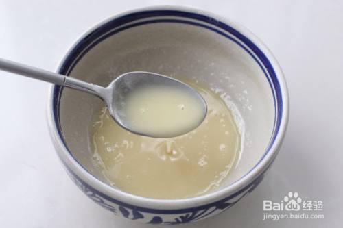 碗中放入昆荡两勺面粉,接着淋上2勺热油,搅拌匀称,油酥就做好了。