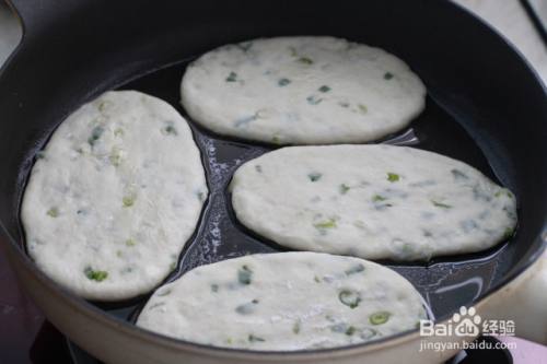 平底锅中刷一层食用油,将做好的饼胚放进去开小火。