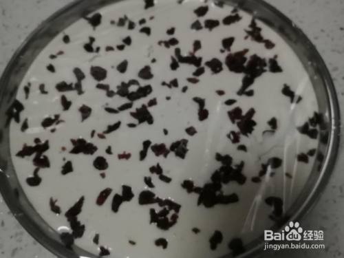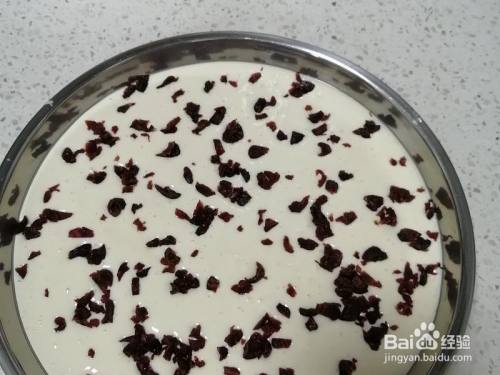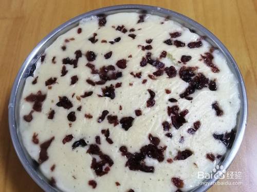 把搅拌匀称的米浆倒入蒸盘举行二次发酵,等候历程切点蔓越莓干。