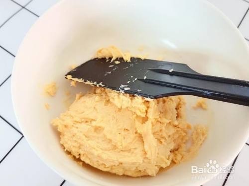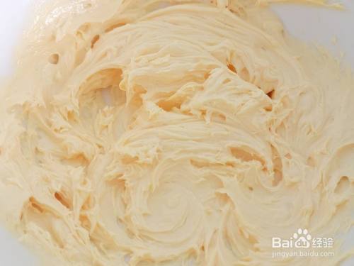 黄油软化(用手指按压黄油,轻轻的能按出一个小坑就好),插手糖粉,蛋黄,用打蛋器打至体积膨胀发白状况即可。