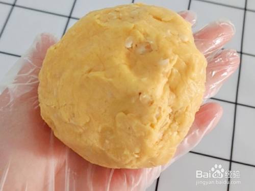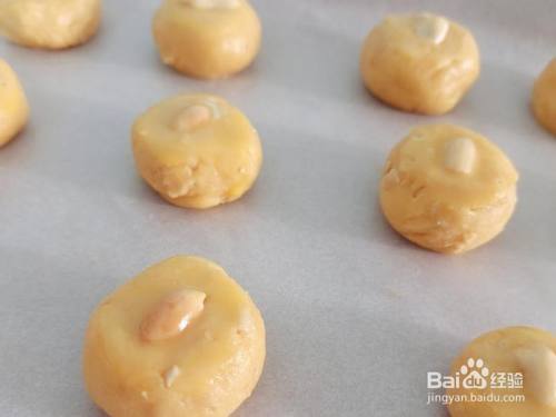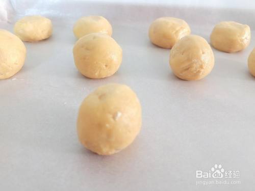 把面团揉当作小圆球,放在烤盘上,(温度高黄油容易融化,黏糊糊的,这时可以放入冰箱冷冻一会比力好操作。)
