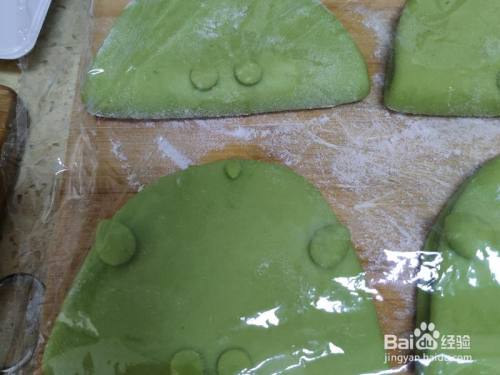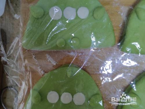 剩下的菠菜面团,用裱花嘴刻出来两个小圆形,放在半圆片下边当小脚脚。揉两个小水点放在两头当小手手,再搓一个小长条放在顶端当天线。
