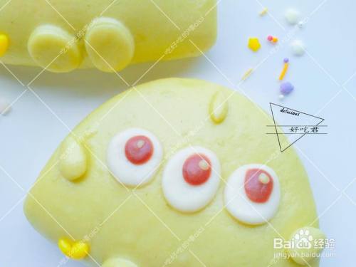 白色面团擀开,用裱花嘴刻出来圆形,摆在小手手中心,当眼睛。