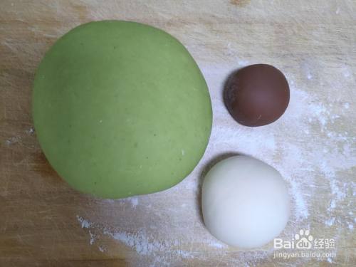 白色面团拿出来一小份,插手可可粉,揉当作可可面团。三种面团做好以落伍行发酵。